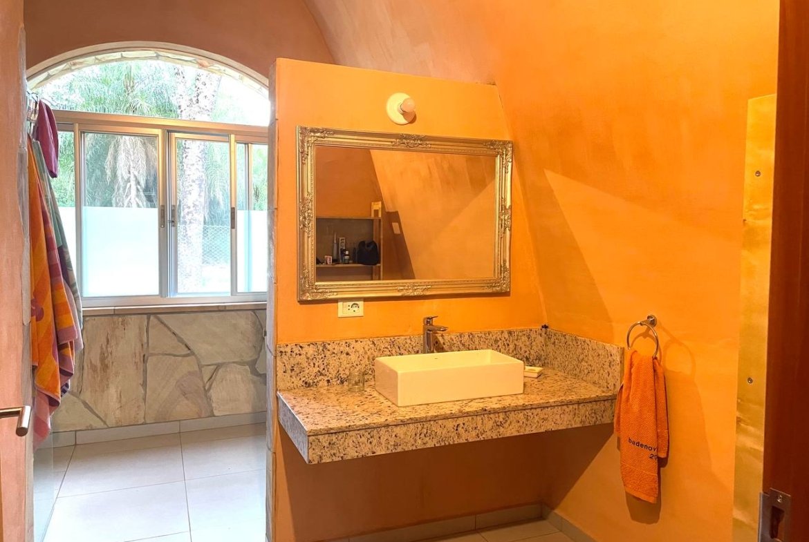 En torno a Parcela de 3.400 m² totalmente vallada puede esperar un jardín bien cuidado con Mango, mandarina, fruta de la pasión y plátanos y un Invernadero y población de árboles viejos. En Piscina de agua salada (10 × 3 m, La amplia y luminosa terraza se integra armoniosamente en el entorno natural e invita a relajarse. Una amplia Terraza de piedra natural (aprox. 100 m²) con cubierta Zona octogonal ofrece espacio para el encuentro, tranquilidad y vistas al verde entorno.