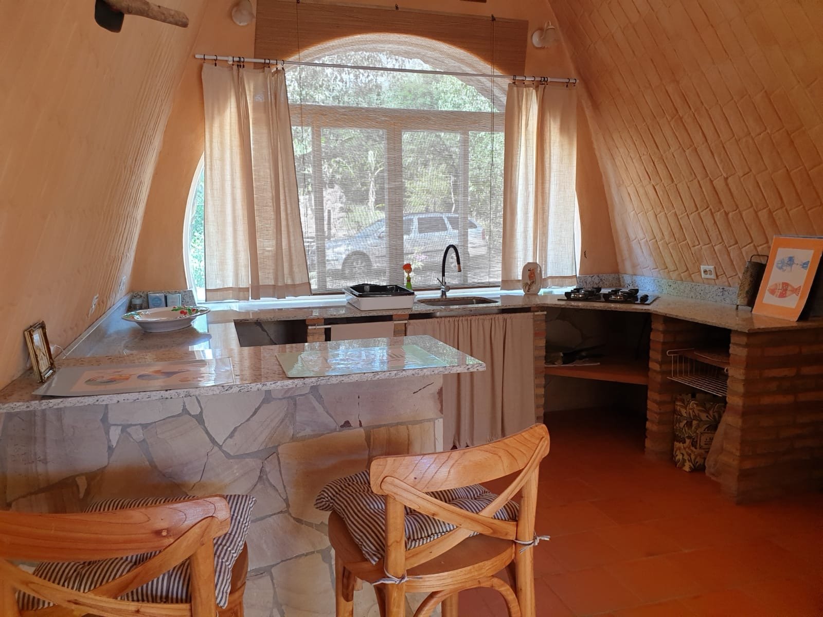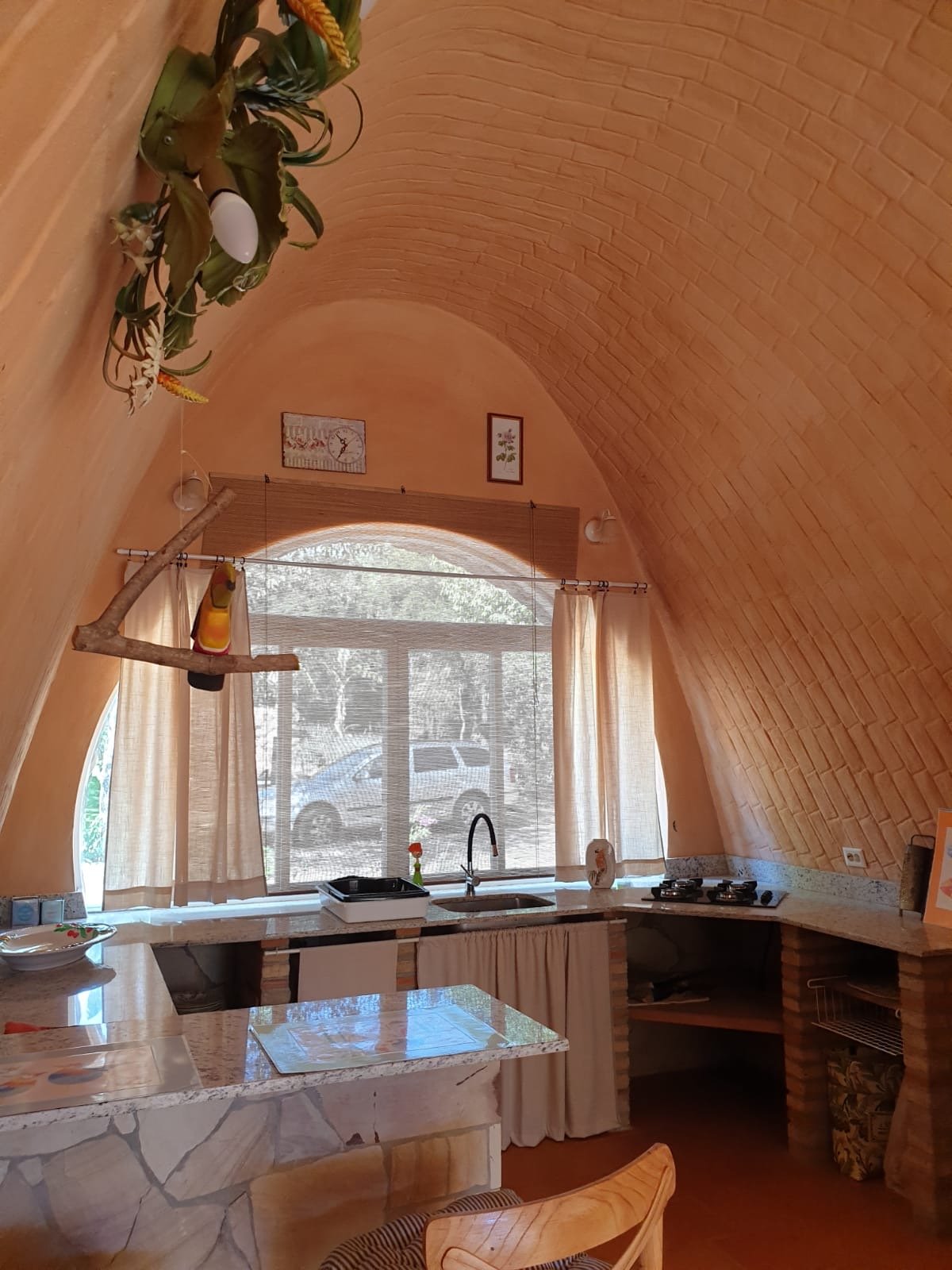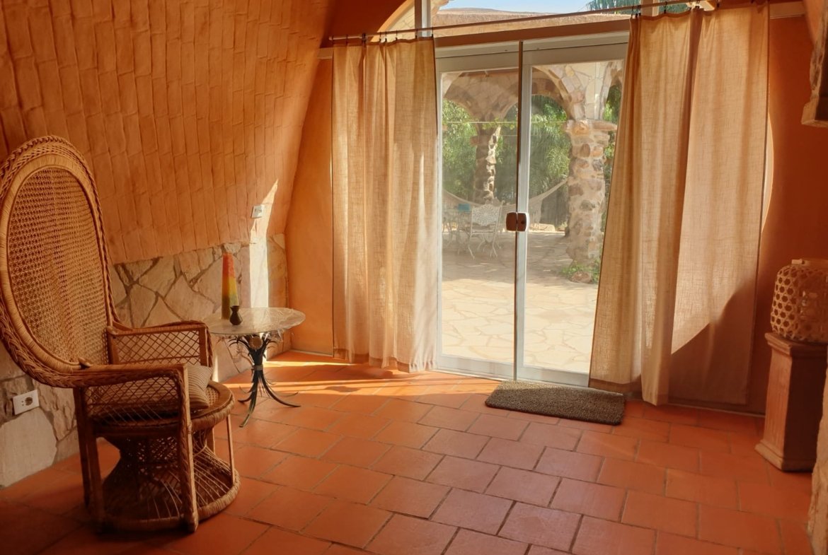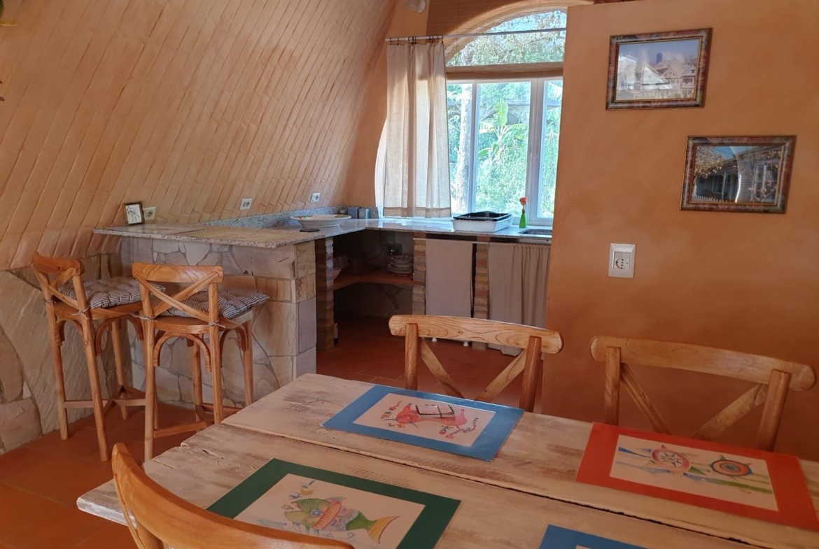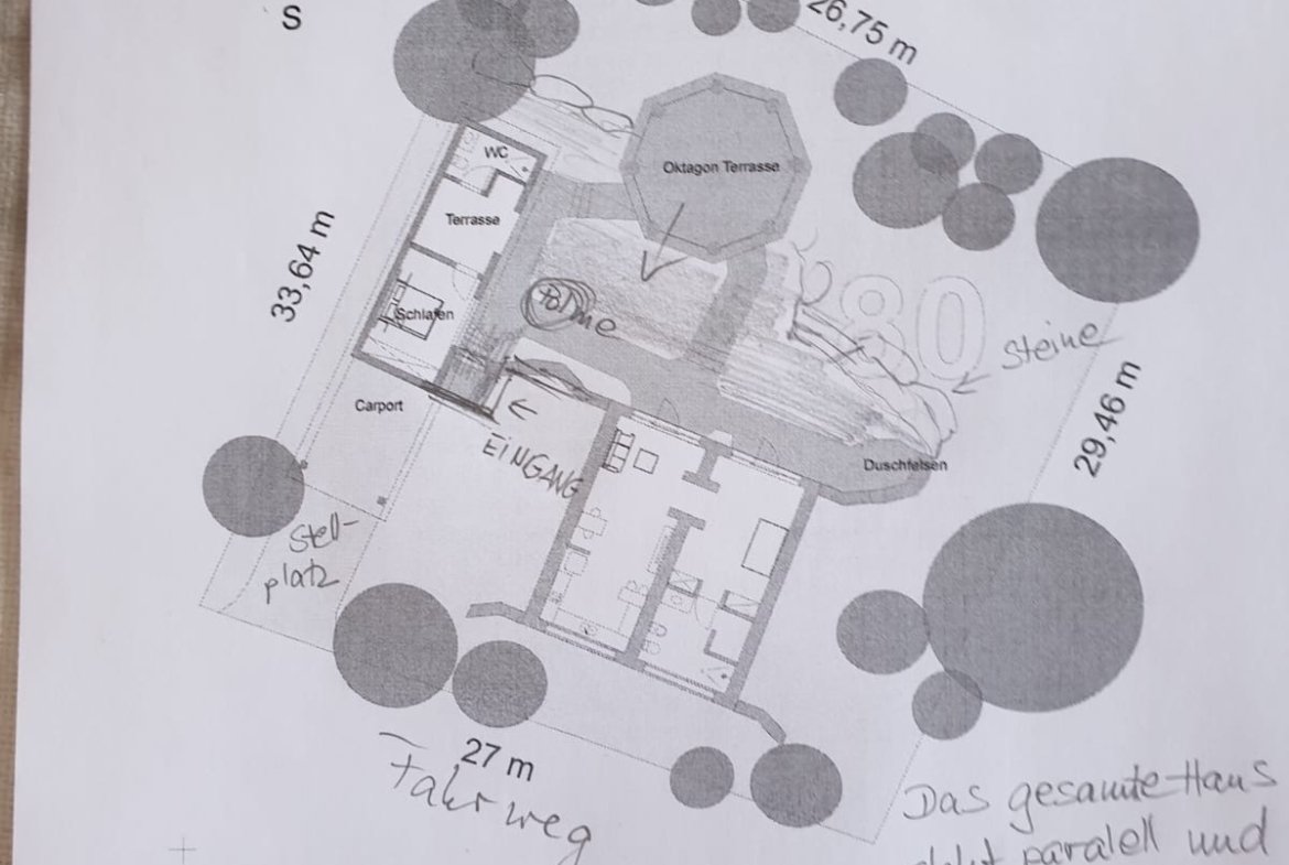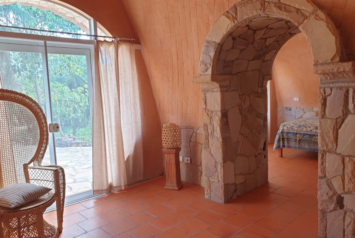 A casa foi construída como um edifício de terra com um telhado verde e impressiona por suas formas orgânicas, elementos de pedra natural e cores quentes. Os materiais naturais de alta qualidade e a carpintaria personalizada conferem à propriedade caráter, qualidade e durabilidade.